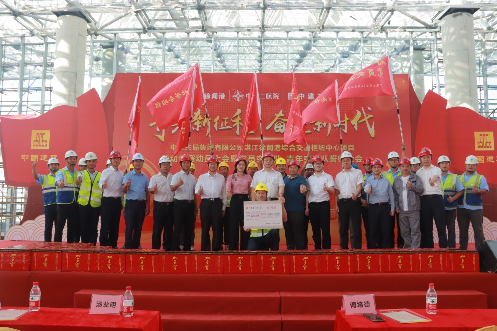 争先新征程,奋进新时代——10月26日,湛江徐闻港综合交通枢纽中心项目举行劳动竞赛暨党员突击队、青年突击队誓师大会。来自中建三局安装工程有限公司的300余名港口建设者在这里吹响奋斗号角。 广东省工业工会副主席傅培德出席活动并作动员讲话,号召全体建设者创先争优、攻坚克难,加速推进徐闻港建设,为广东经济建设再立新功。 徐闻县总工会,湛江徐闻港有限公司、中交二航院、中建三局等参建单位负责人、项目全体员工、工友代表近300人参加活动。活动中,中建三局安装公司南方分公司党委书记、总经理曹彬彬致辞,党委副书记、工会主席朱文成宣读竞赛方案。傅培德等分别为劳务分包单位代表、党员突击队、青年突击队代表授旗并为项目一线工友发放慰问品。据悉,该项目从10月底起,将围绕安全生产、质量创优等目标开展一系列全员竞赛活动。 参建单位中建三局安装公司工会主席、纪委书记汤业明表示,举办此次竞赛活动,旨在号召全体参建员工积极投身到劳动竞赛及突击队活动,顺利完成1220竣工验收节点任务,确保项目实现2020年春节通航目标。